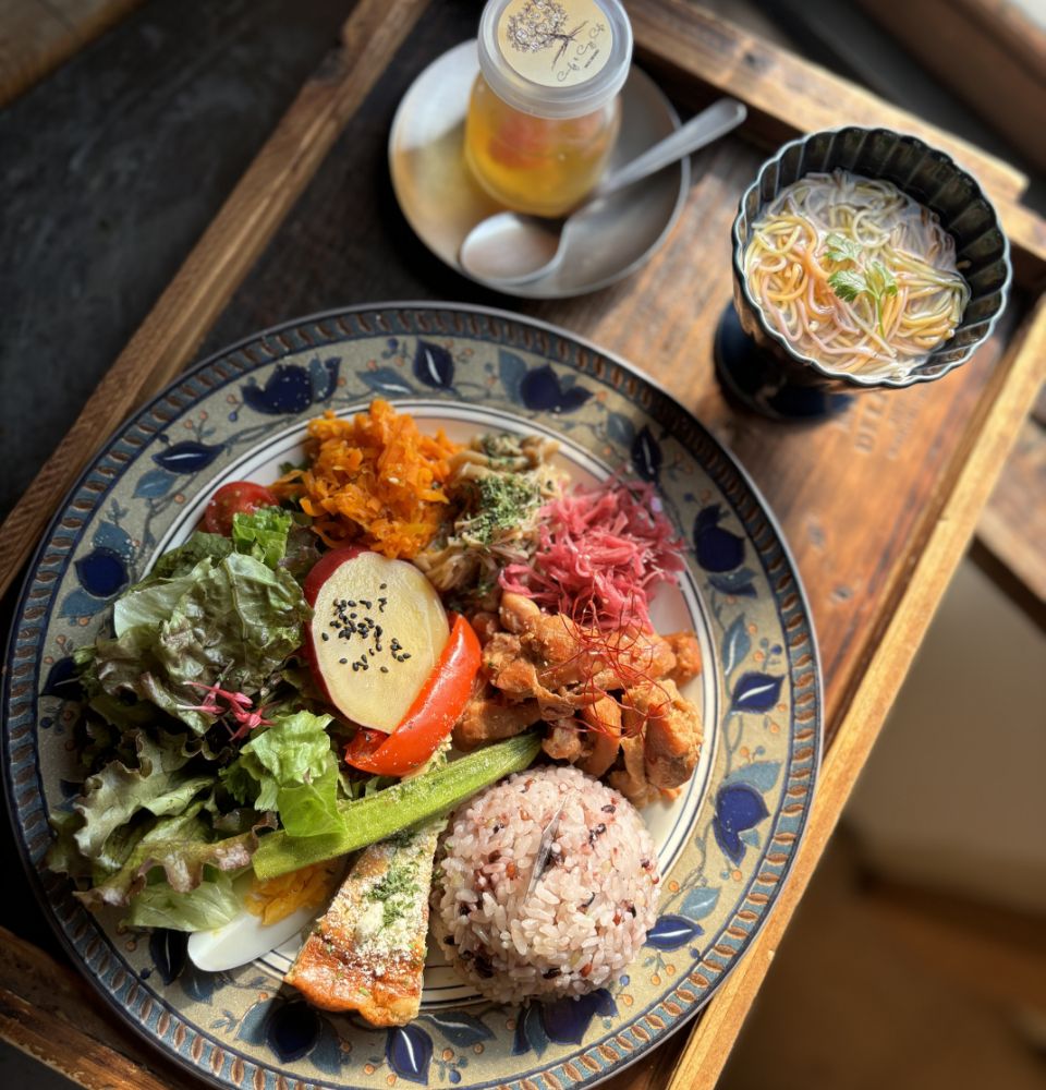 築150年以上の古民家を巧みに改装。和洋のアンティークを散りばめたおしゃれ空間で、独創的な料理やドイツ風パンケーキ、スイーツを楽しめる。